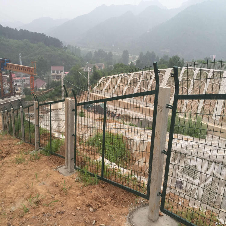 5、防腐處理:金屬網(wǎng)片及柵欄門的網(wǎng)片成形后應整體鍍鋅并進行熱浸塑(或噴塑)處理,鍍鋅量270g/m2,浸塑厚度0.8mm~ 1.2mm,顏色選用墨綠色。涂層應均勻,顏色-致,表面光滑,無流柱,滴瘤、粉泡、漏鐵等缺陷。網(wǎng)片制造精度要求:長度誤差≤2.5mm,高度誤≤3.0mm。網(wǎng)片平整度要求:凸起或凹進值≤5.0mm.冷拔鋼絲鍍鋅前直徑誤差≤0.06mm。焊接網(wǎng)孔誤差≤3.0mm.焊接網(wǎng)片連接板時,連接板焊接位置應嚴格控制在設計位置,其位置誤差≤1.5mm。矩管邊框與連接板、網(wǎng)片鋼絲與鋼板、網(wǎng)片鋼絲與矩管邊框的焊接宜采用電阻焊、如用釬焊,應選用合適的焊條,使其變形。焊接后應清理焊渣。對焊接產(chǎn)生的變形,應進行平整處理。為保證網(wǎng)片自身有足夠的強度,網(wǎng)片焊接點的強度應大于1KN,焊接點脫落數(shù)小于4%。