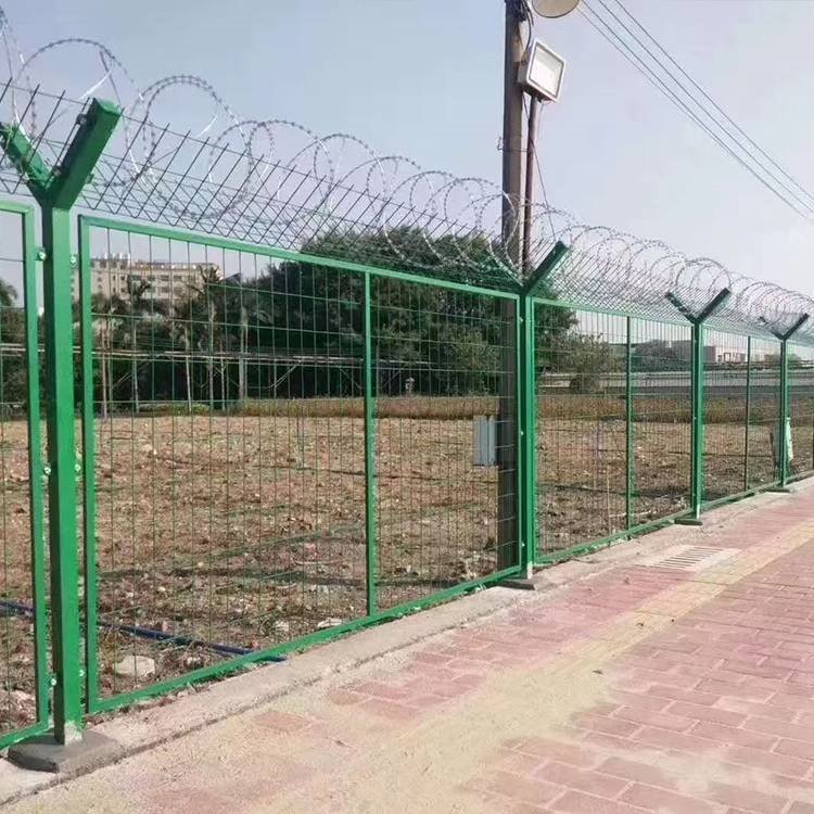 護欄網(wǎng)直接在地面上裝置時,刺繩的裝置辦法有兩種: Y型裝置法和直線裝置法。Y型裝置法是裝置滾筒刀片刺繩的辦法;直線裝置法是裝置一般刺繩的辦法,直接把刺繩擺開固定在立柱或獨自的固定架上。