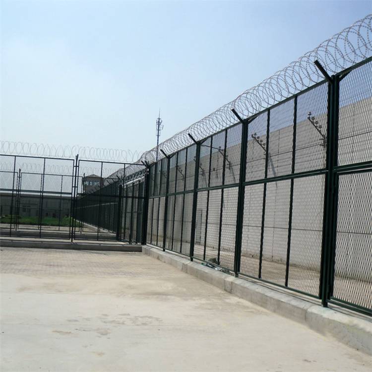 監獄鋼網墻的特點:內側或頂部加裝螺旋雙交叉式蛇腹形刀刺網,形成一道高不可攀、難以逾越的隔離障礙。具有堅固耐用、美觀大方、刀片鋒利、防攀爬、抗強風、抗沖擊、抗剪切、抗腐蝕,其產品花色多樣,美觀大方,根據顏色的調配能與當地景觀達成一致。其安全性能系數高、防攀爬能力好,網片連接方式采用鍍鋅防盜螺絲連接,有效防止人為的破壞性拆卸。