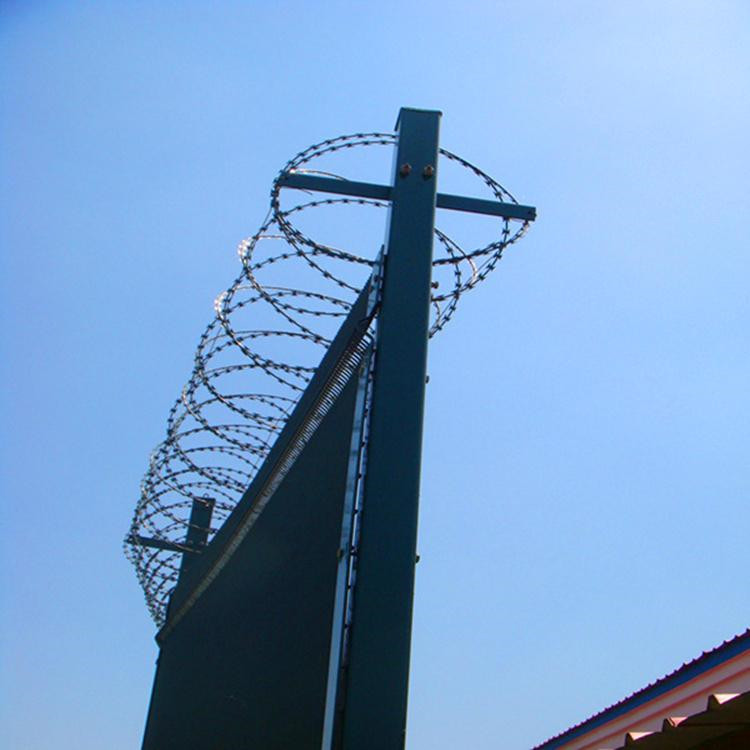 立柱:60*80mm,80*80mm,80*100mm,100*100mm等矩形鋼,頂部焊有V型之架,用以架設(shè)蛇腹型刀刺網(wǎng)