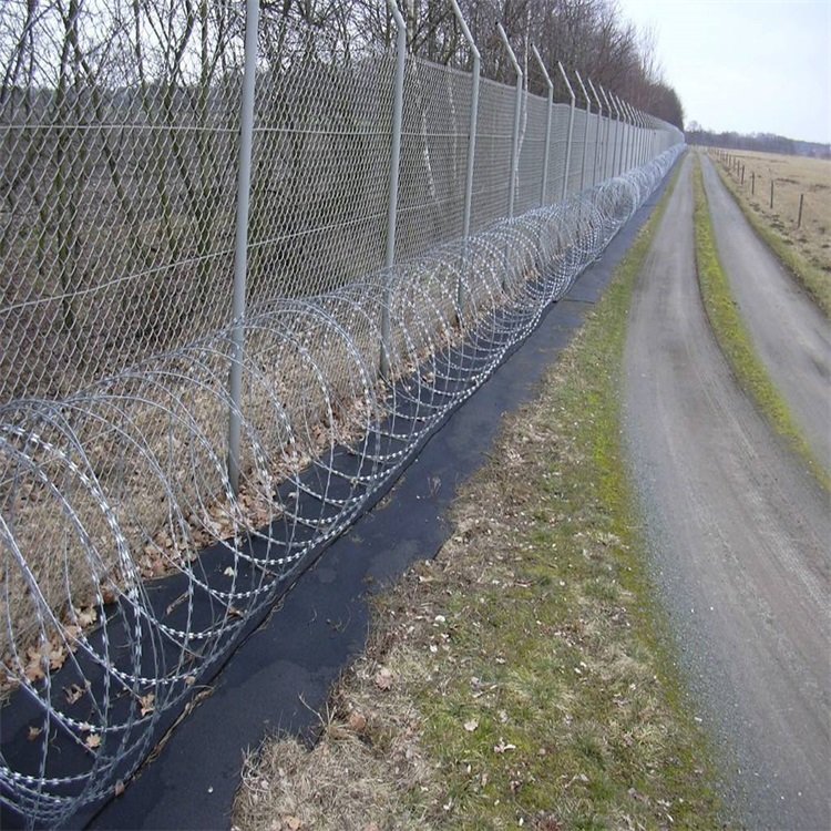 近年發(fā)展起來的防護、隔離能力較強的新型防護網(wǎng)產(chǎn)品。它采用鋼板沖壓成型包附于鋼絲之上,由銳利尖角鍍鋅鋼板或不銹鋼薄板做刀片,高張力鋼絲做芯線組合而成的。根據(jù)形狀可分為:螺旋式-刀片刺網(wǎng)、交叉式-刀刺網(wǎng)、平板式-刀片刺網(wǎng)、直線式-刀片刺網(wǎng)被廣泛應(yīng)用在監(jiān)獄,機場,軍事基地等高安全場所。