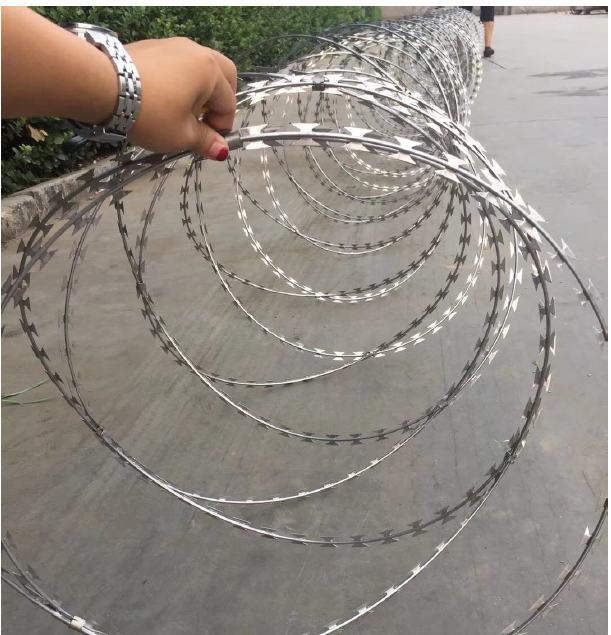 刀片刺網(wǎng),是一種近年發(fā)展起來(lái)的防護(hù)、隔離能力較強(qiáng)的防護(hù)產(chǎn)品,采用優(yōu)質(zhì)鋼片沖壓尖刺包裹高強(qiáng)度鋼絲壓制而成,雙線用卡扣銜接固定,呈現(xiàn)螺旋型。世界各國(guó)已將刀片刺網(wǎng)廣泛用于軍事重地、監(jiān)獄、政府機(jī)關(guān)、銀行、生活小區(qū)圍墻、私人住宅、別墅圍墻、鐵路柵欄加高以及邊境線等的安全防護(hù)。