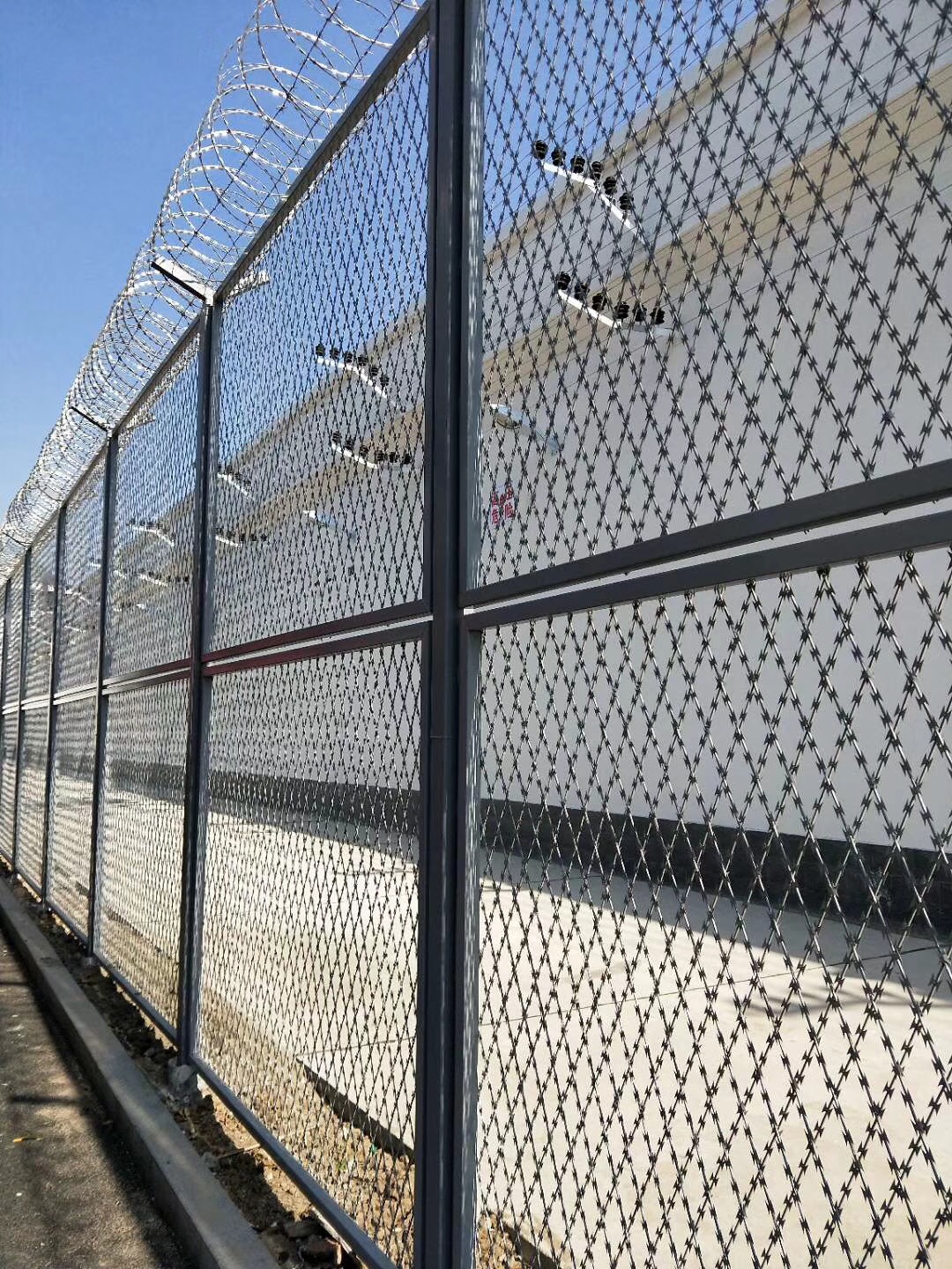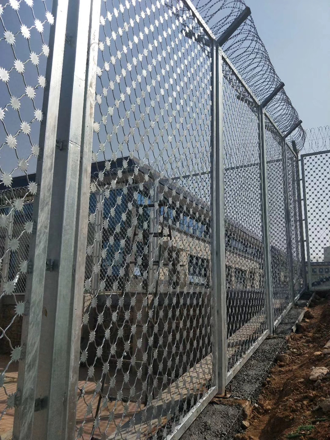 監(jiān)獄鋼網(wǎng)墻又稱作"Y型安全防御護(hù)網(wǎng)”,是由V型支 架立柱加強(qiáng)型焊接片網(wǎng),安全防盜連接件和熱鍍鋅刀片刺籠組成強(qiáng)度和安全