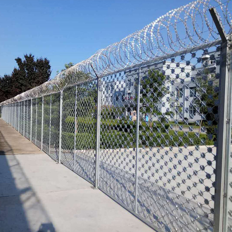 立柱的頂部多數會焊接V型支架(這種立柱也叫做Y型立柱),支架上安裝V型網,再在頂部架設蛇腹型刀刺網,與下方的監獄隔離網完美結合,形成一道難以逾越的銅墻鐵壁。頂部的V型網也可以替換成拉絲,安裝簡便快捷,同時能夠節約成本。立柱頂部的V型支架兩個側臂焊接有專用的刺網鉤,每一-側架2道鋼絲,形成一個V型槽,然后把刀刺網架到上面,并根據要求的拉伸間距拉開,再用專門的不銹鋼卡扣把鋼絲和刀刺網卡在一起,這樣就完成了整個監獄隔離網的安裝。