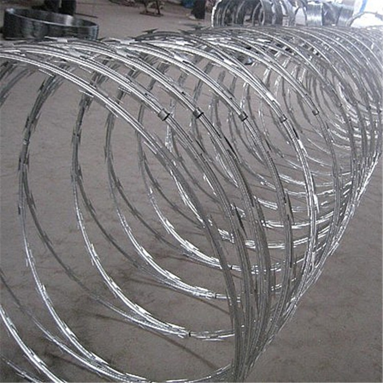 刀片刺絲又名刮刀型刺絲,是一種近年發展起來的防護、隔離能力較強的新型防護網產品。它采用鋼板沖壓成型包附于鋼絲(筋絲)之上,由銳利尖角鍍鋅鋼板或不銹鋼薄板做刀片,高張力鋼絲做芯線組合而成的。鋒利的刀型刺由雙線扣裝后成蛇腹狀,既美觀又讓人不寒而粟。起到了很好的阻嚇作用。該產品具有美觀、防阻效果好、施工便利等優點。